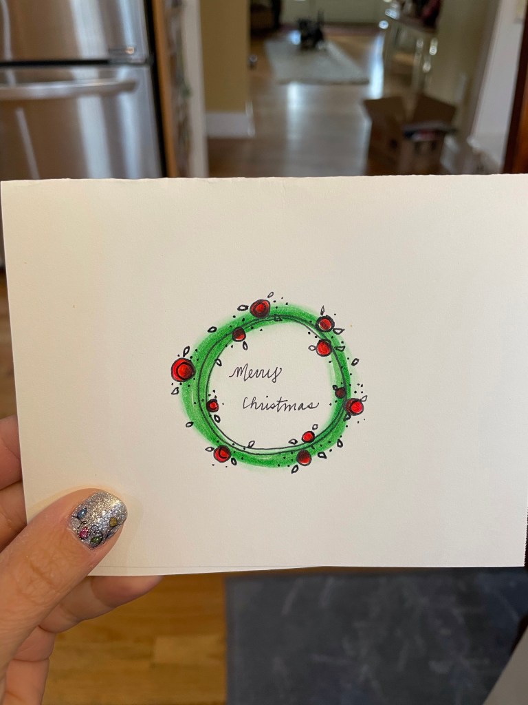 A few blank pieces of paper, thin markers and some doodling are all you need. I looked up holiday doodles on Pinterest for ideas. The gift receivers all loved them.