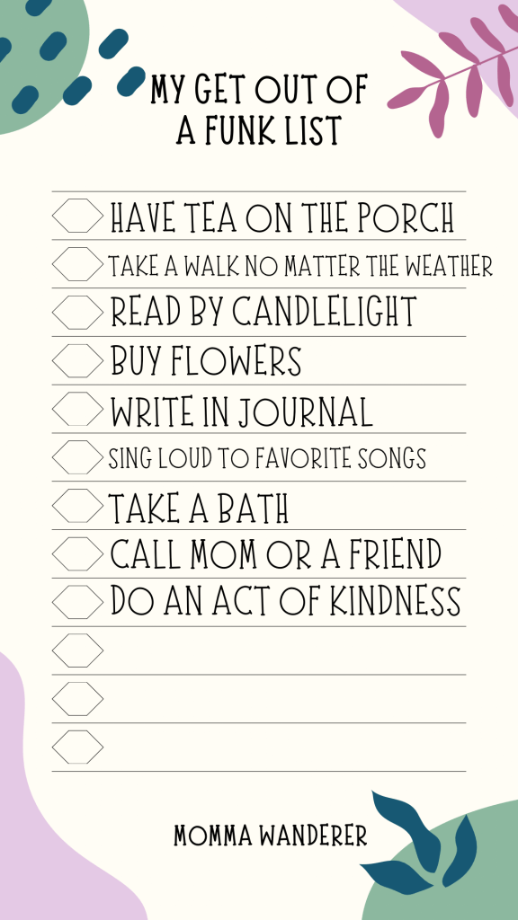 Our weather has been cool and rainy. I want snow and winter fun right about now! Our household, like most I know, have been dealing with illnesses. I’ve been in a bad mood to say the least. I’ve looked back on my two blog posts regarding this, see here and here, and made a new list for myself today.