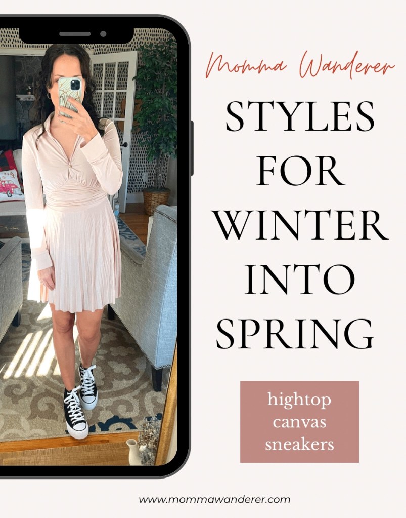 I’m starting what I hope will be a weekly series, Styles for Winter Into Spring. This week I have five outfits to wear with hightop canvas sneakers, i.e. Converse. I have a knock off Amazon pair that I love and want to share with you all.