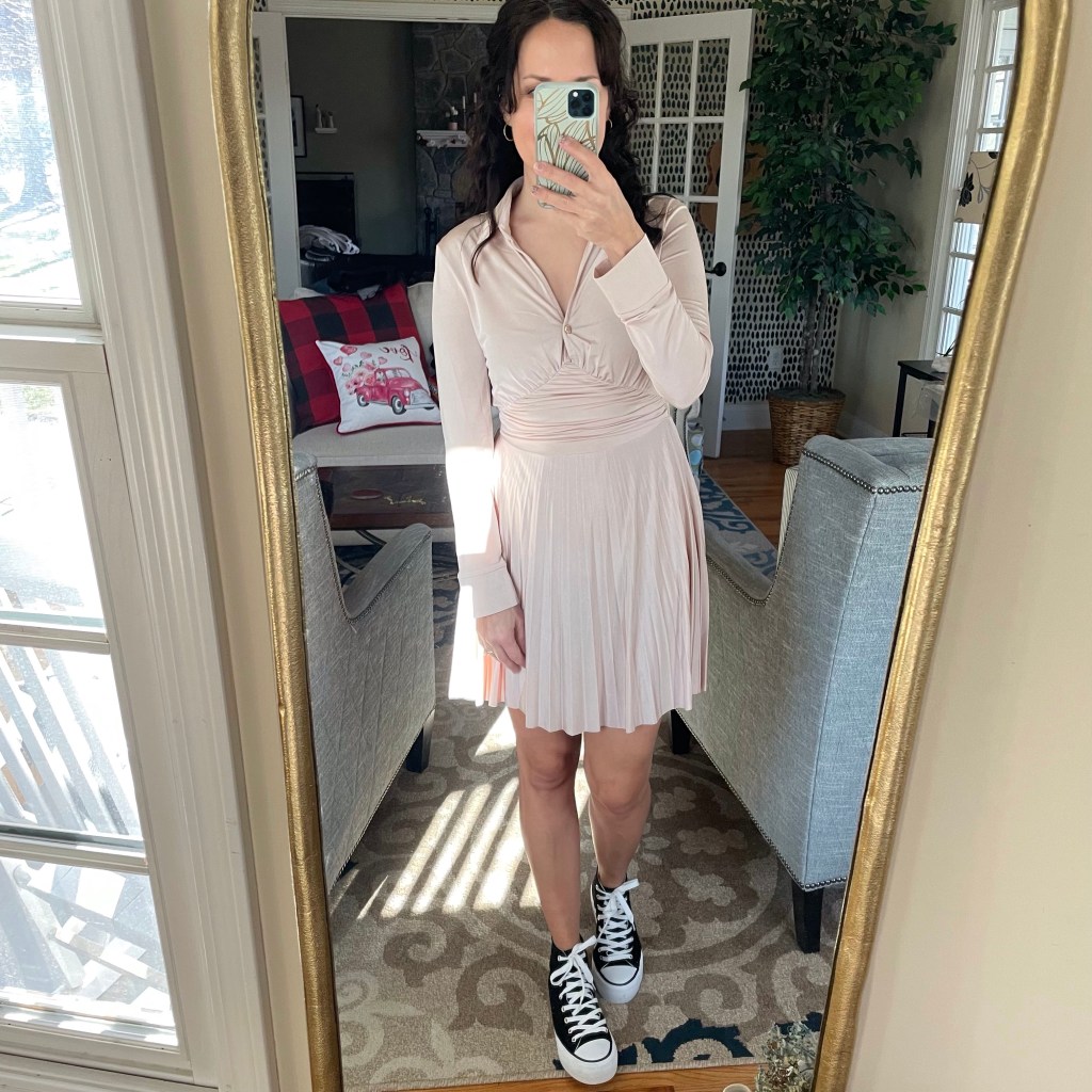 This dress doesn’t have great reviews but I love it. The v-neck comes down too low for everyday wear so you can see here I secured it above my bra line. I used an earring lol. These sneakers will likely work with many of my dresses, even fancier ones, and I’ll be showing a lot of those styles when the warmer spring air comes in.