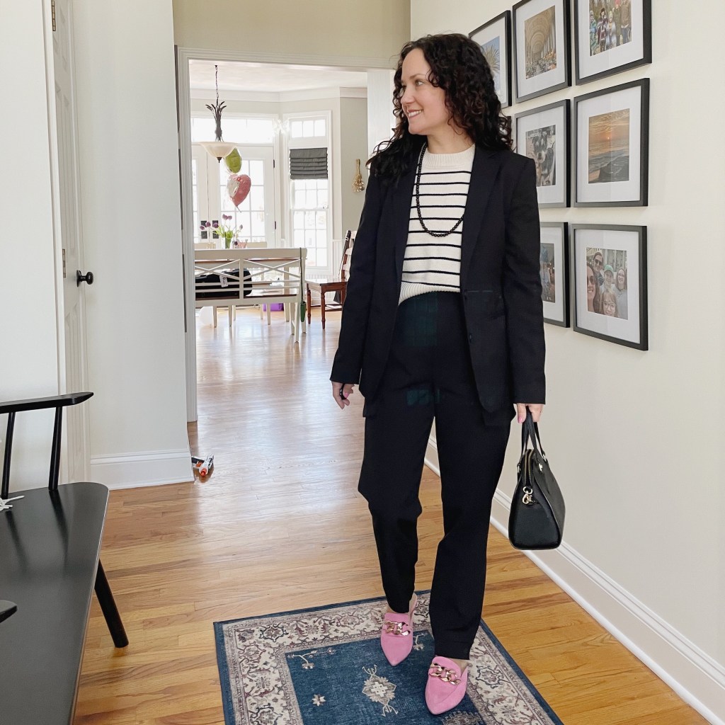 This was an all black outfit I wore for Wednesday Wednesday. In case you weren’t aware, I am using Wednesday Addams as my style guru for Wednesdays until further notice lol. I have on a tighter black v-neck top, also from Athleta, and my favorite Amazon puffer vest. Simple black Nike sneakers keep it comfortable and stay-at-home mom casual.