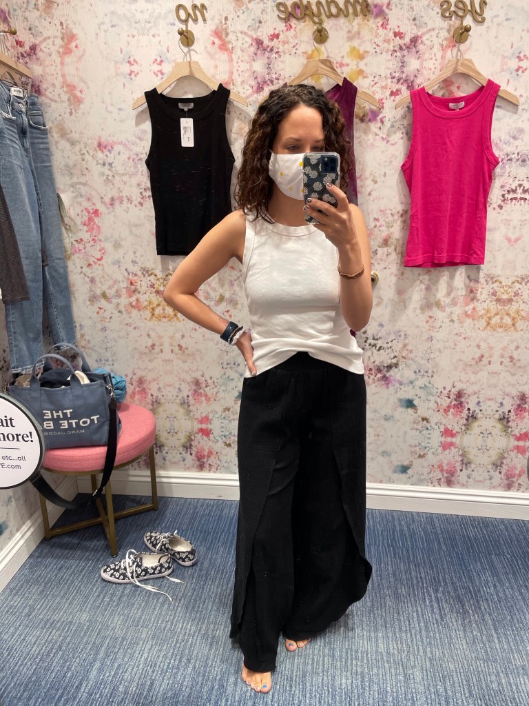 With any of these tops I generally tuck them in or wear a little front tuck. I just grabbed a new Minnie Mouse t-shirt to wear to Disney this spring (linked here) and being it’s cropped I won’t tuck it in. I usually wear this bra tank underneath many of my white tops.