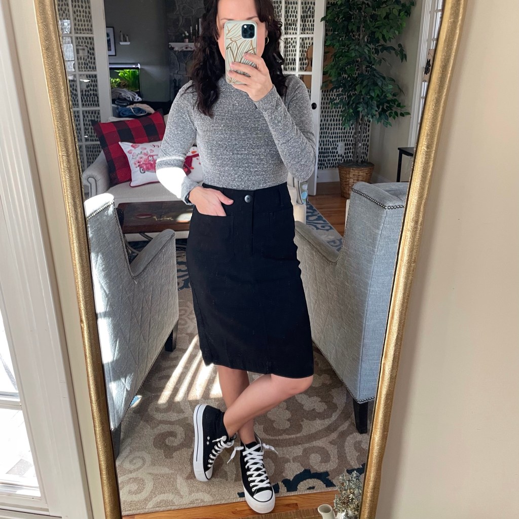My second pencil skirt in this blog post, also from Anthropologie (click here for link) is a denim style one. I chose to size down in this one to give a more fitted look at the waist.