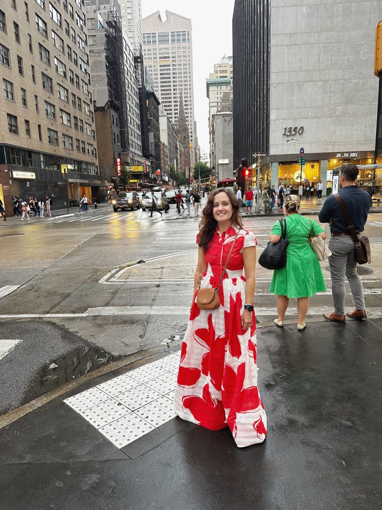 My dress was Self Portrait, black blazer that I only wore a tiny bit (so not needed, it was hot) from Nordstrom and the boots, believe it or not, are from Target (linked here) and were so comfy walking around the city. Please see my Momma Wanderer page on LTK for all outfit links, thanks!