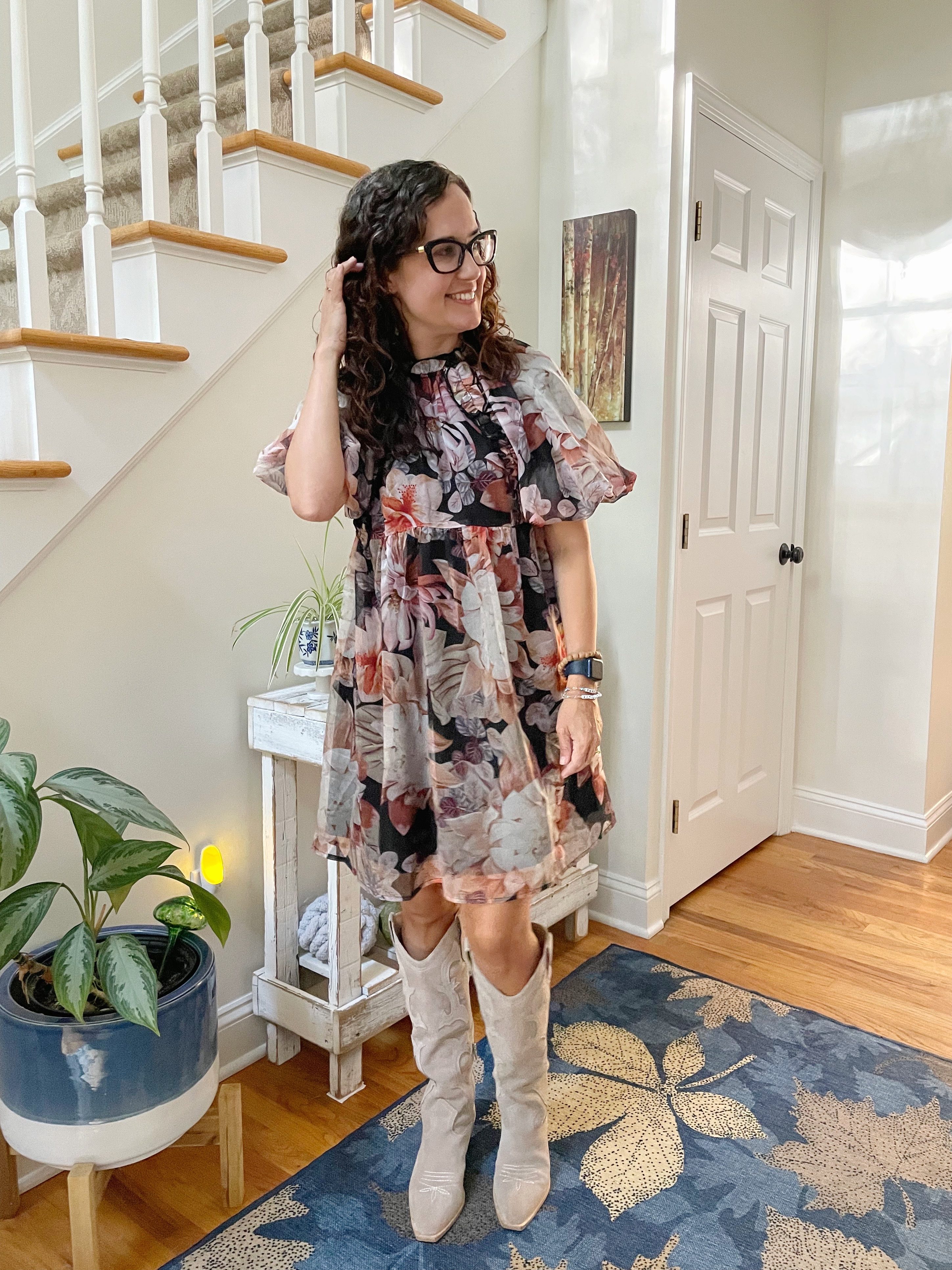 The dress outfit below was for a warmer autumn day (like upper 60s). I love that the warm florals match the color of my boot. Pairing these boots with any autumn dress works well! I’ll be adding tights and a jacket (like a jean jacket) for a cooler day. This just might be what I wear on Thanksgiving this year ;)