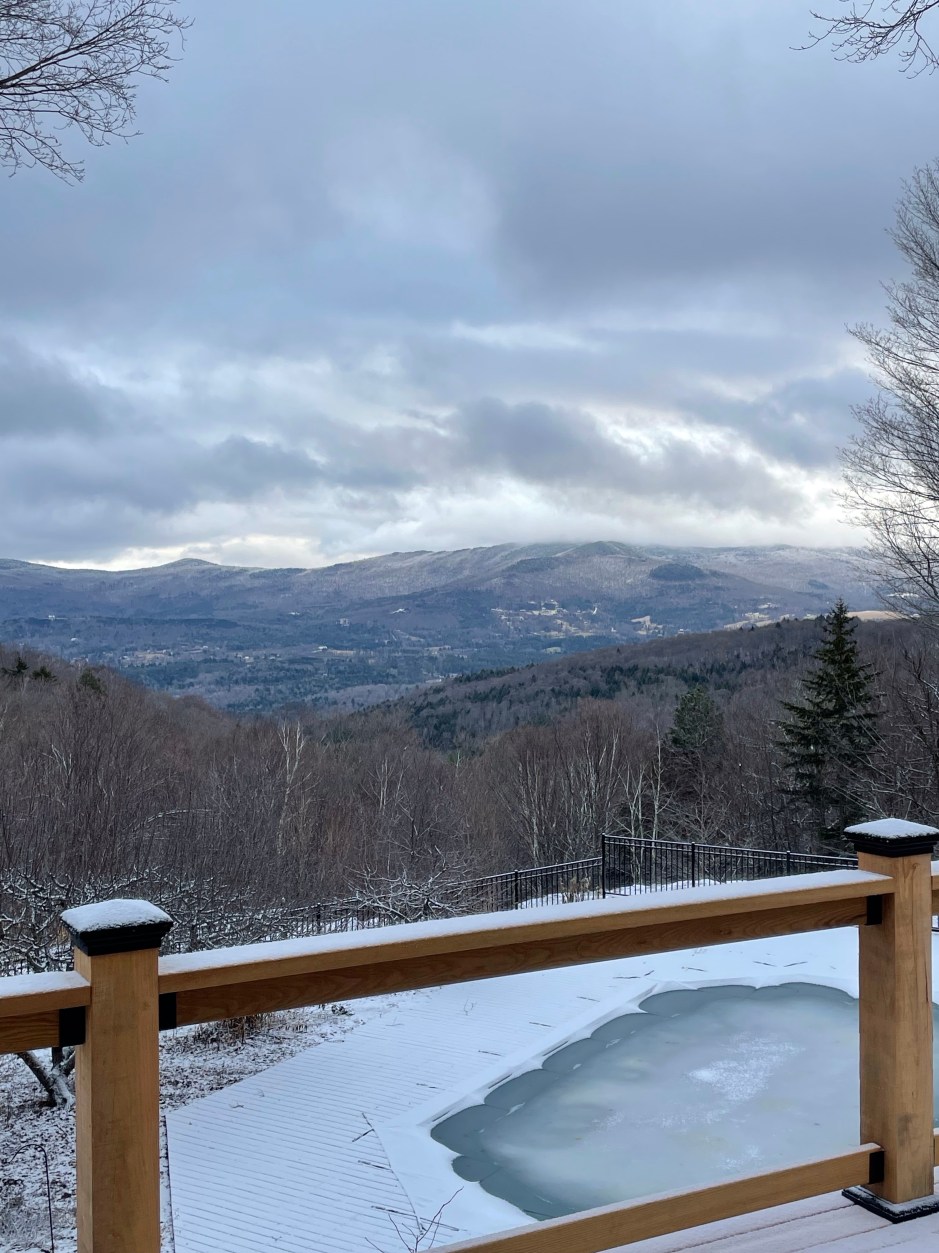 As I write this I am sitting in Vermont, looking out a large slider door with a view of snow capped mountains. My dog is on a blanket on the floor by my feet and I’m in leggings and a sweatshirt. Living the dream!