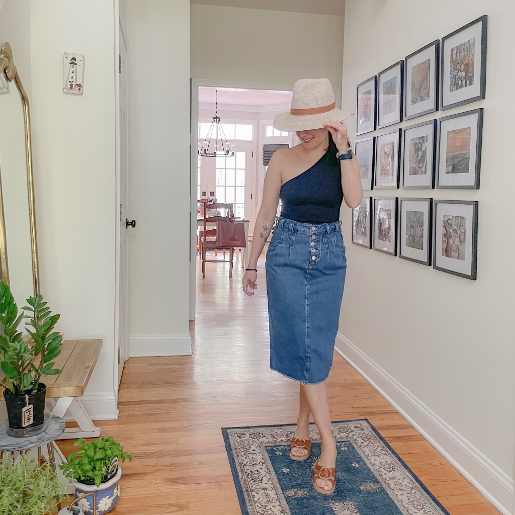 I purchased this Target top to pair with my midi denim skirt and I love the combination. The top would be an easy match for many spring and summer skirts. The sandals are also from Target and I love them!