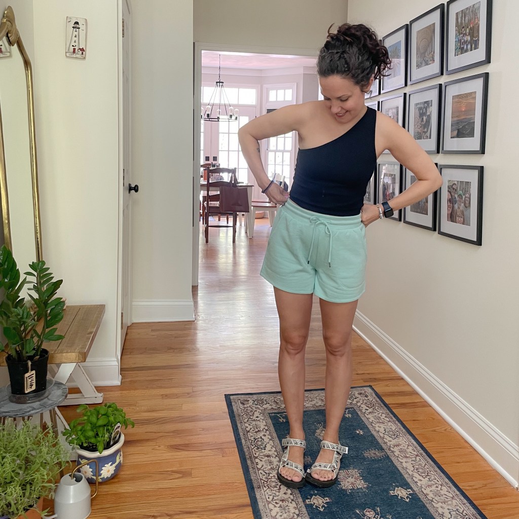 This is totally a Mom-bumming-around-the-house outfit. Last summer I lived a lot in my two pairs of Teva sandals, the ones below and these ones. Always comfortable.